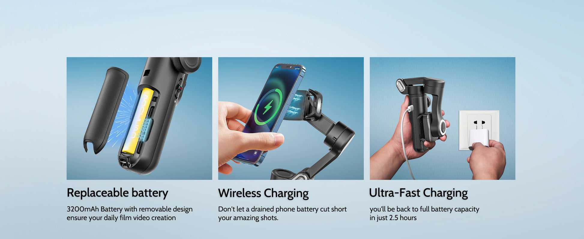 MAKE YOUR OWN HITCHCOCK MOVIES LIKE A PRO: Using our innovative focus switch and zoom slide, this mobile gimbal stabilizer allows you to make your own Hitchcock movies without having to learn complex filmmaking skills. Synchronized, smooth focus speed adjustments. Plus, the 3 brushless motors of the Smart X Pro add more power than other brands of gimbals. The high-capacity 3200mAh battery allows for extended runtime of up to 12 hours.