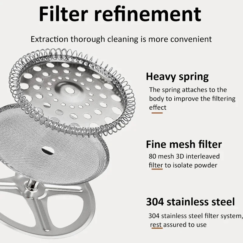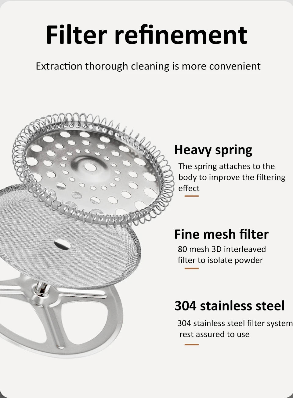 3. Thickened filter screen spring, use the filter screen to cling to the pot wall, which not only further improves the filtering effect but also greatly increases the service life, reaching more than 30,000 times.