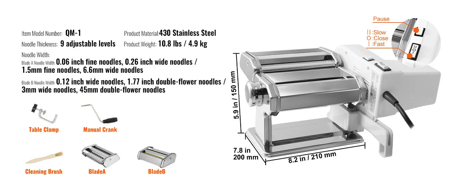 Noodle Thickness: 9 adjustable levels, 0.01-0.1 inch / 0.3-3 mm